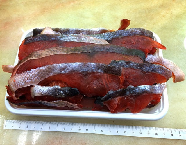 原材料名:鮭(北海道産)、食塩、ソルビトール、調味料(アミノ酸等)、くん液、着色料(紅麹色素)
